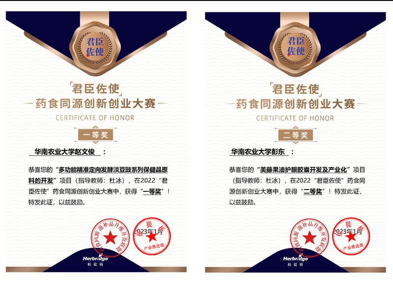 近日,2022“君臣佐使”药食同源创新创业大赛圆满落幕,在我校食品学院国家中药材产业技术体系岗位科学家团队带头人杜冰教授地指导下,赵文俊和彭东两名同学的项目从参赛的120余个项目中脱颖而出,分别荣获一等奖和二等奖。