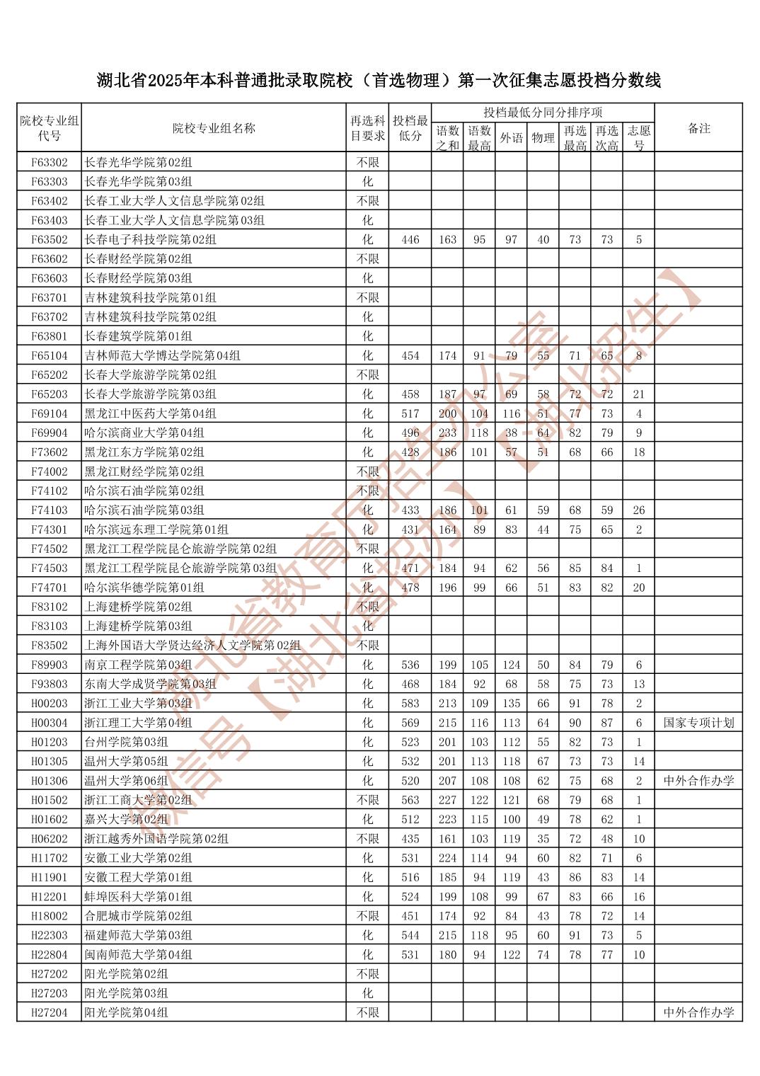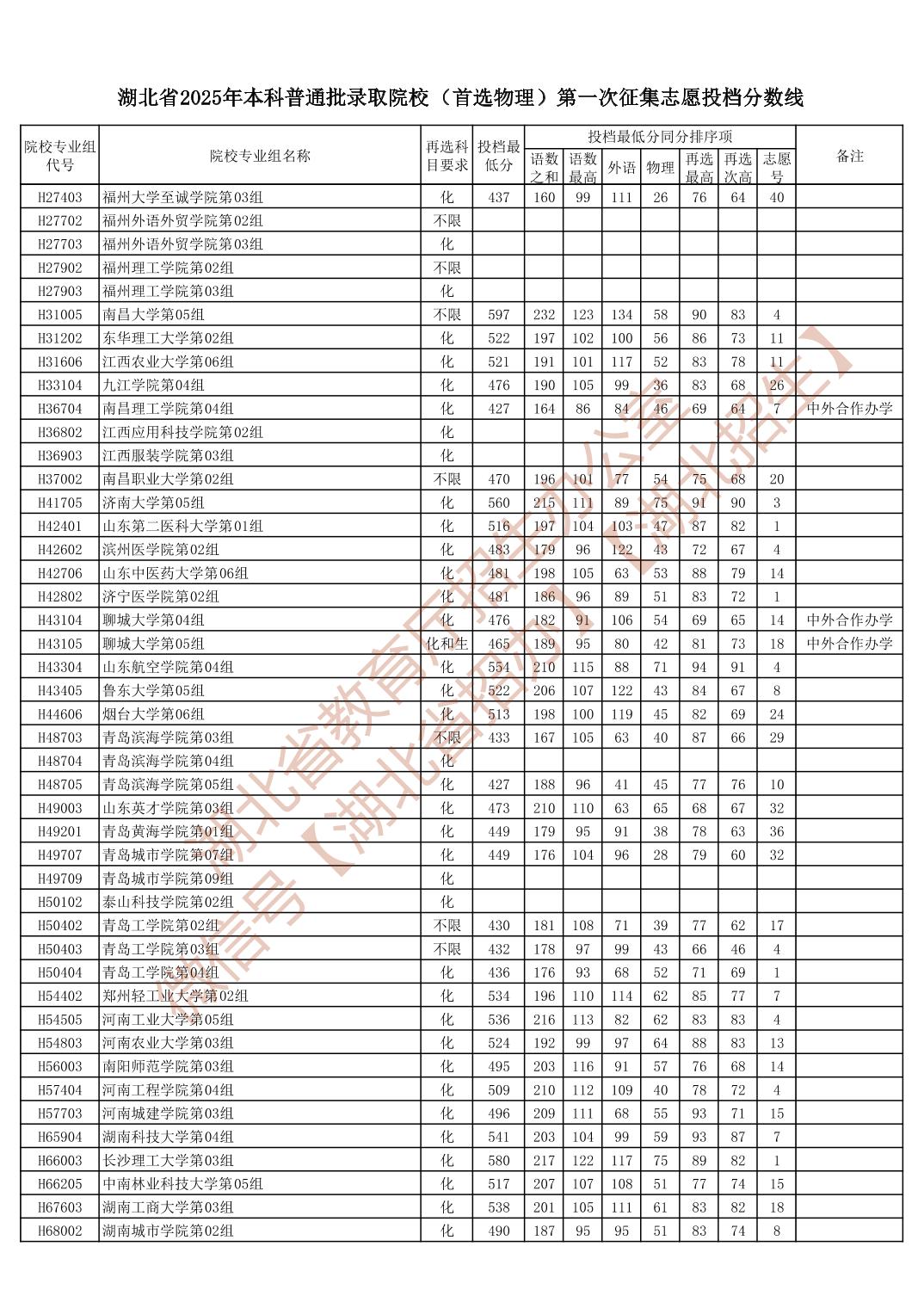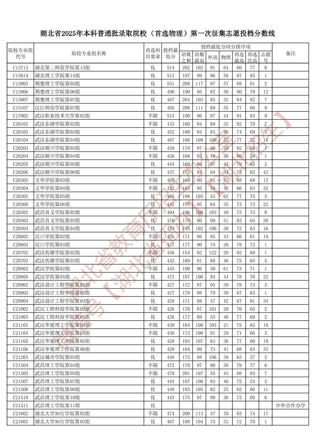 湖北省2025年本科普通批录取院校(首选物理)第一次征集志愿投档分数线
