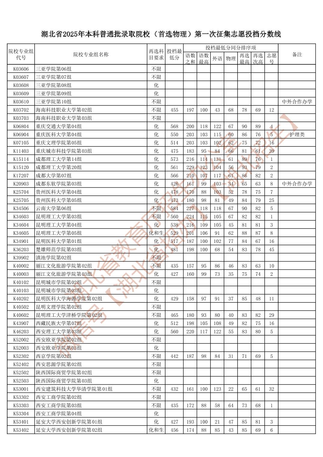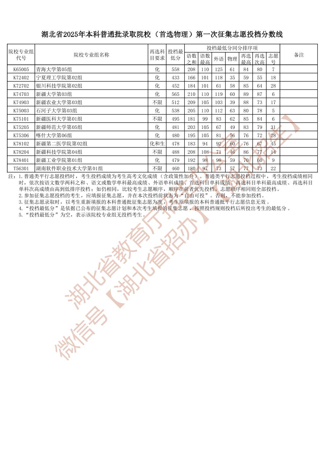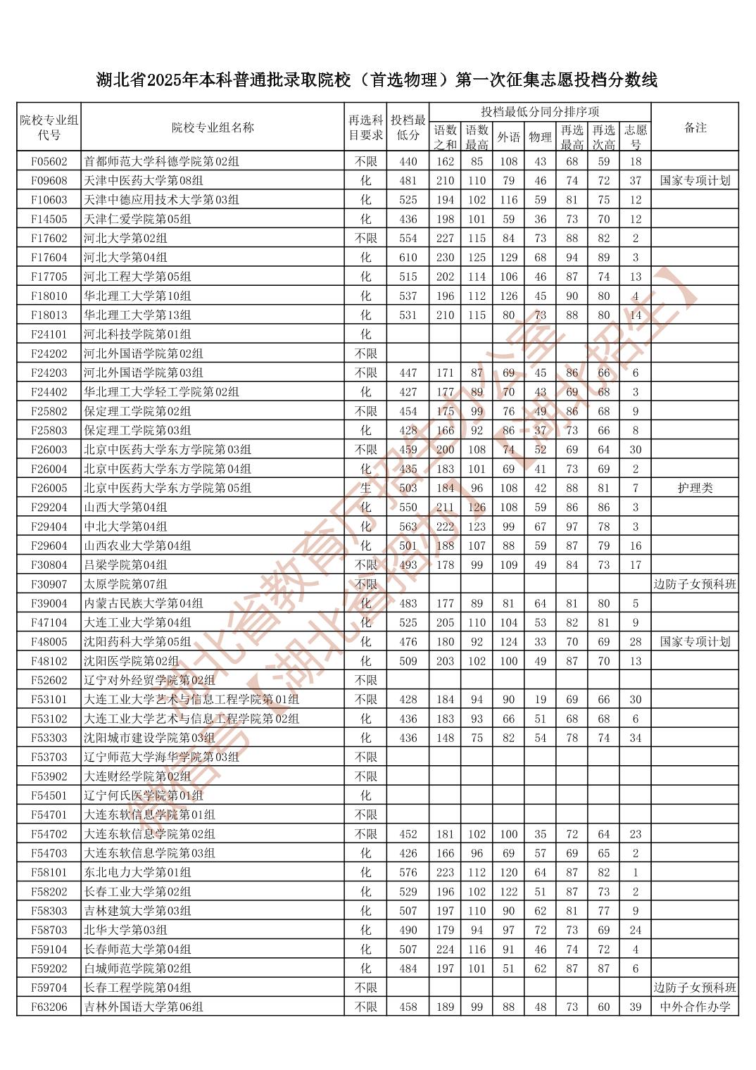 湖北省2025年本科普通批录取院校(首选物理)第一次征集志愿投档分数线