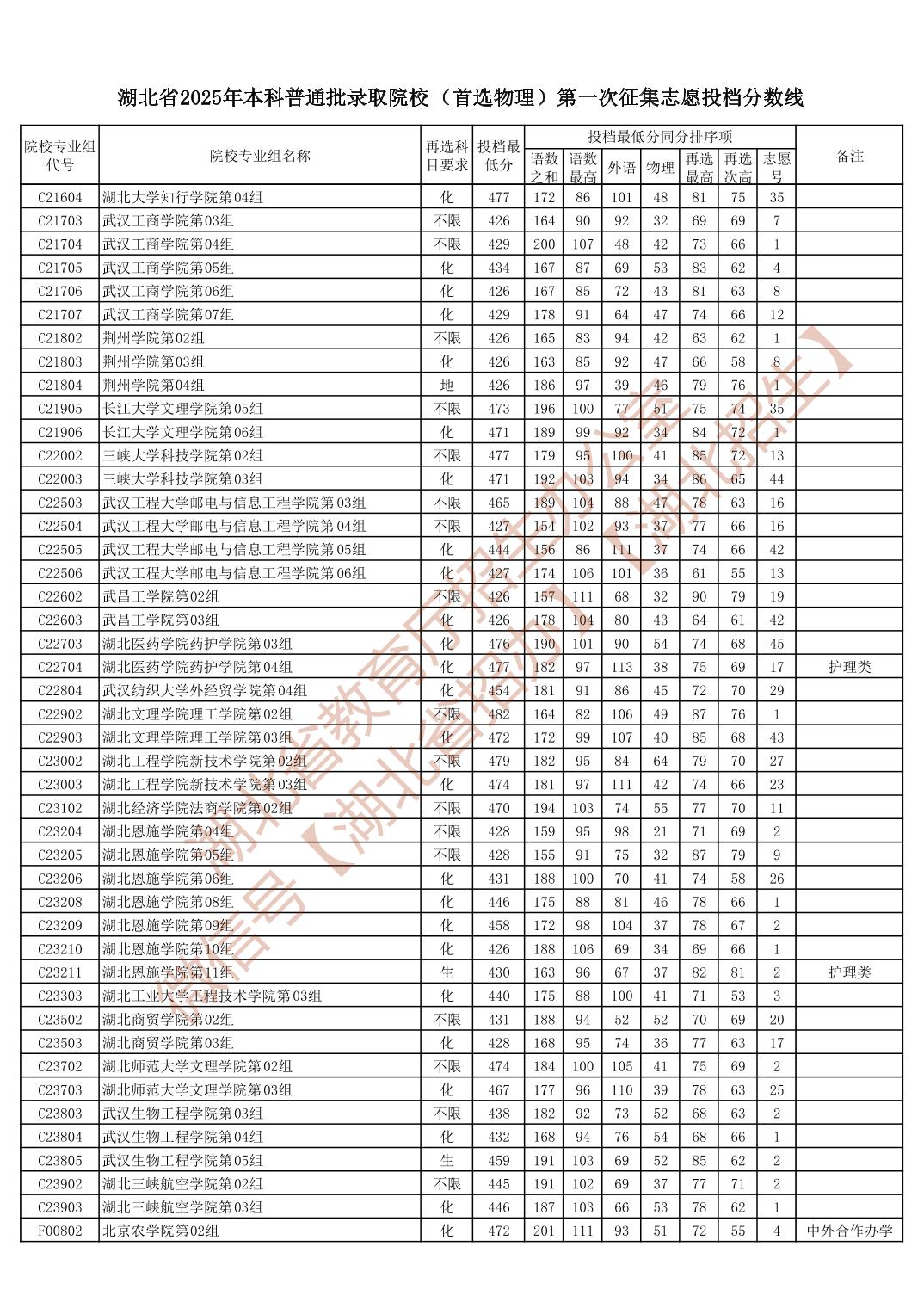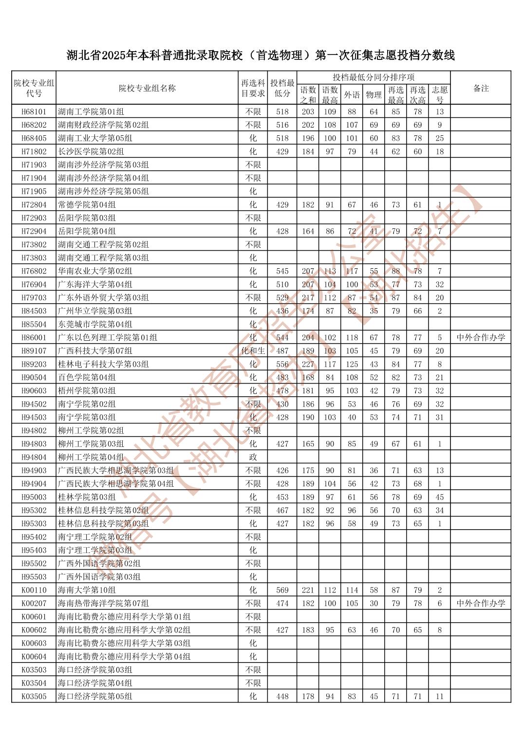 湖北省2025年本科普通批录取院校(首选物理)平行志愿投档分