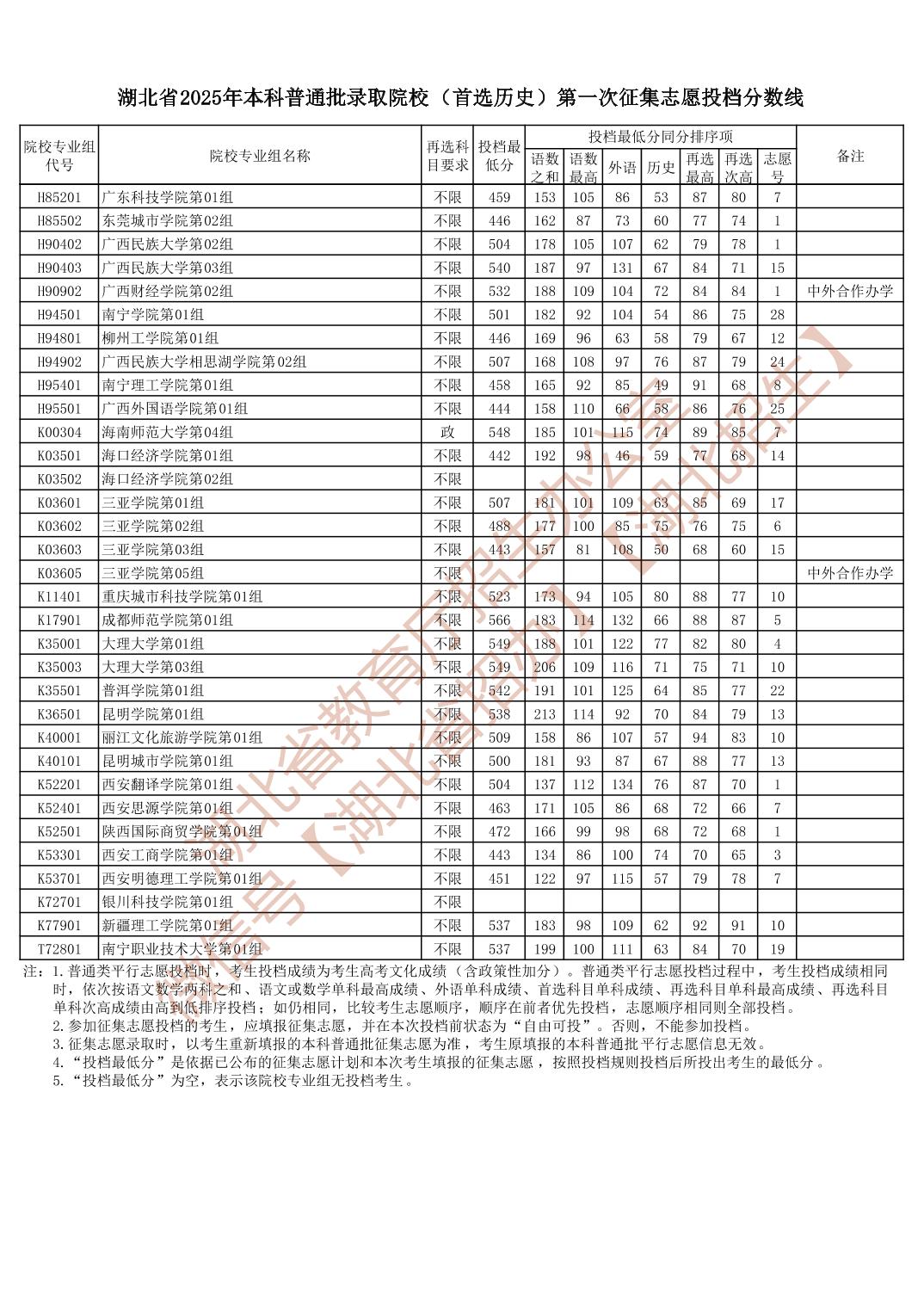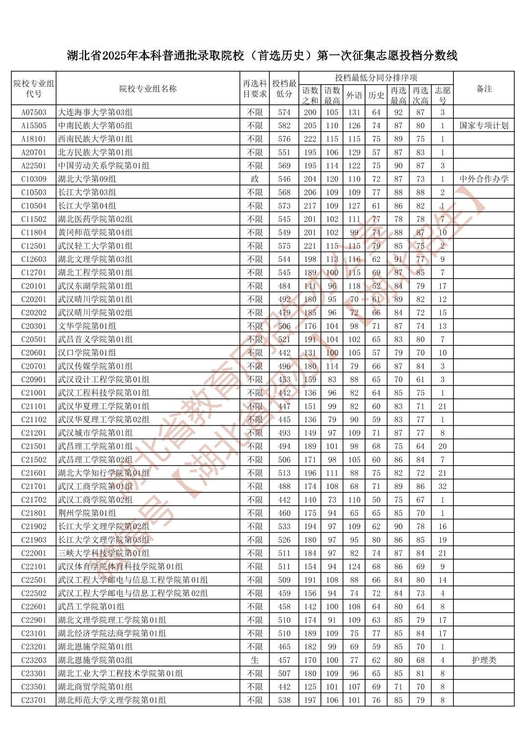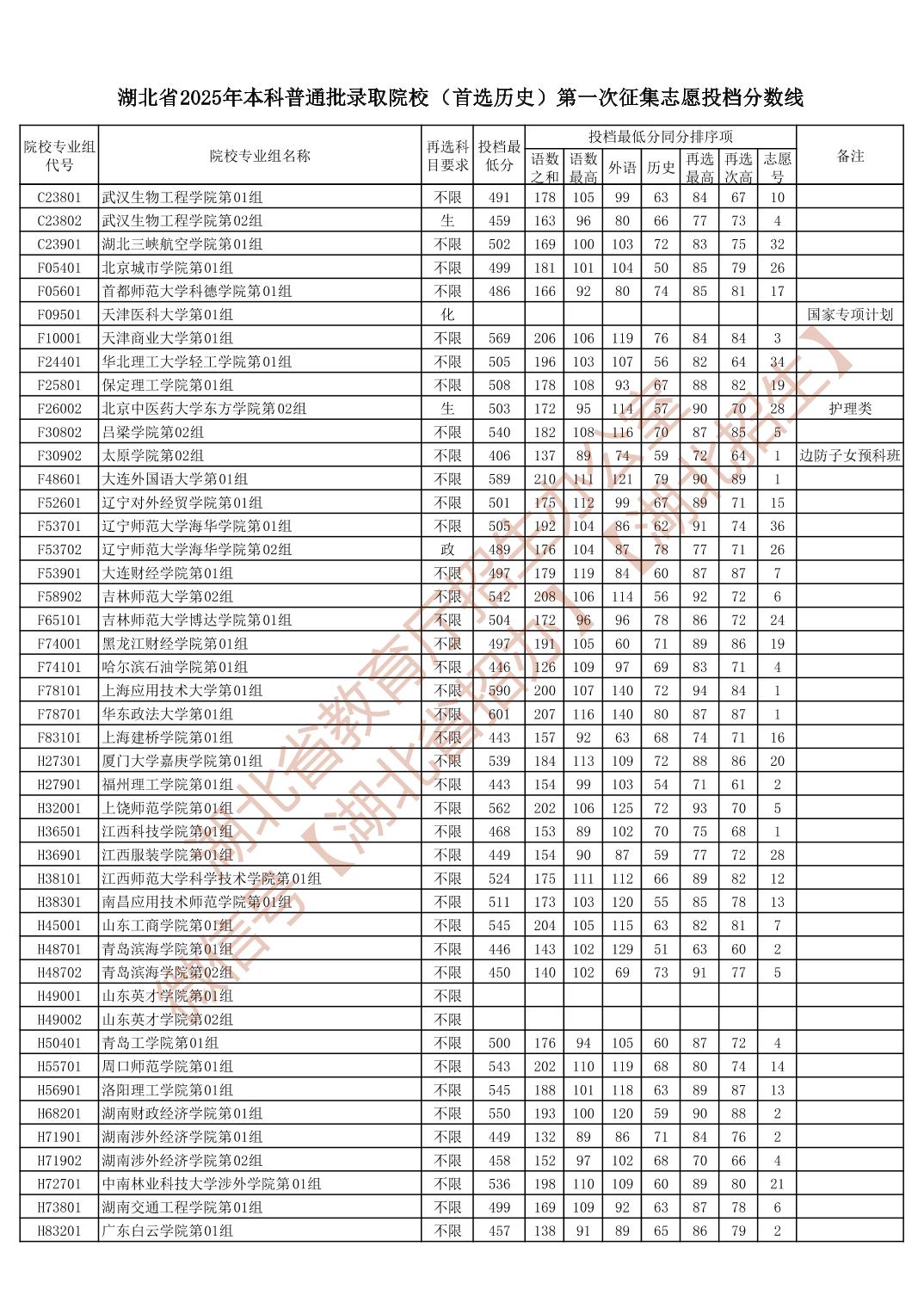 湖北省2025年本科普通批录取院校(首选历史)第一次征集志愿投档分数线