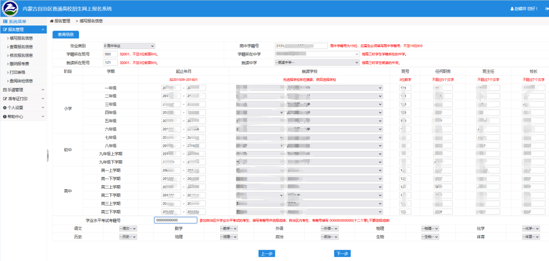 按要求填写教育信息,对高中应届生而言,高三下学期内容可按预期情况填写。