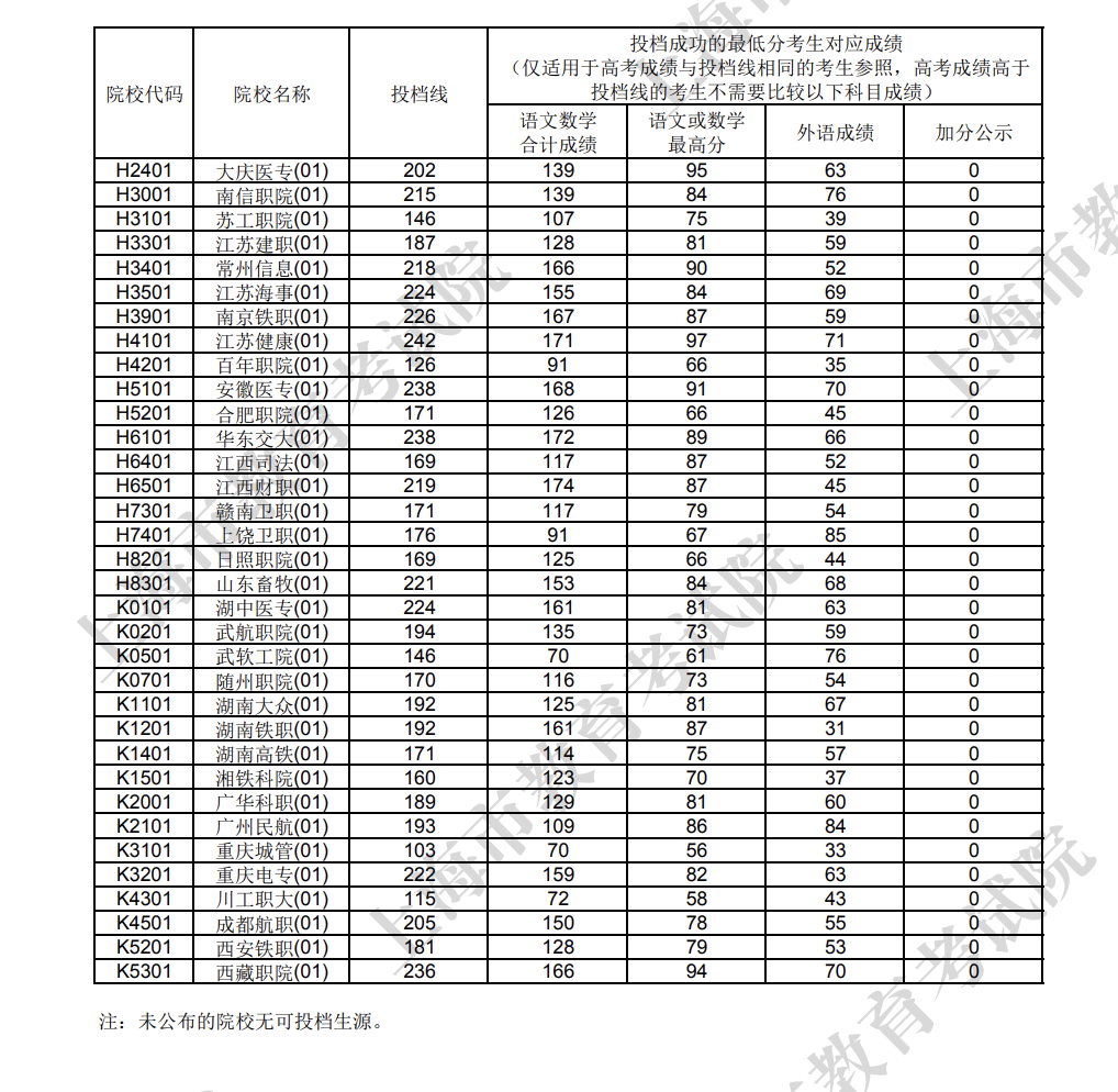 2024年上海市高考专科普通批次平行志愿院校投档分数线公布